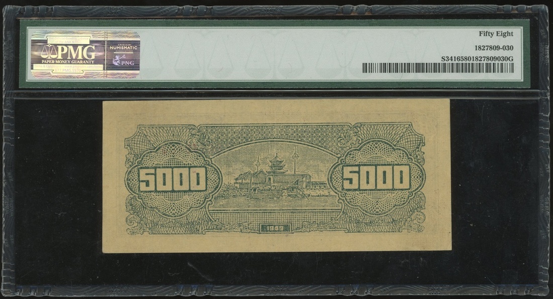 民國三十八年華中銀行伍仟圓,編號BC548464,PMG 58,記錄中僅得6枚獲更高評分,罕見共產時期鈔票