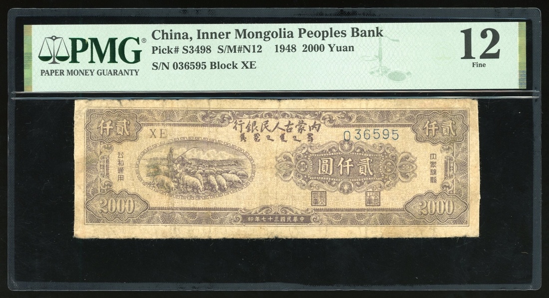 Inner Mongolia Peoples Bank, China, 2000 yuan, 1948, serial number 036595, block XE, (Pick S3498), PMG 12 Fine. All Mongolia notes rare