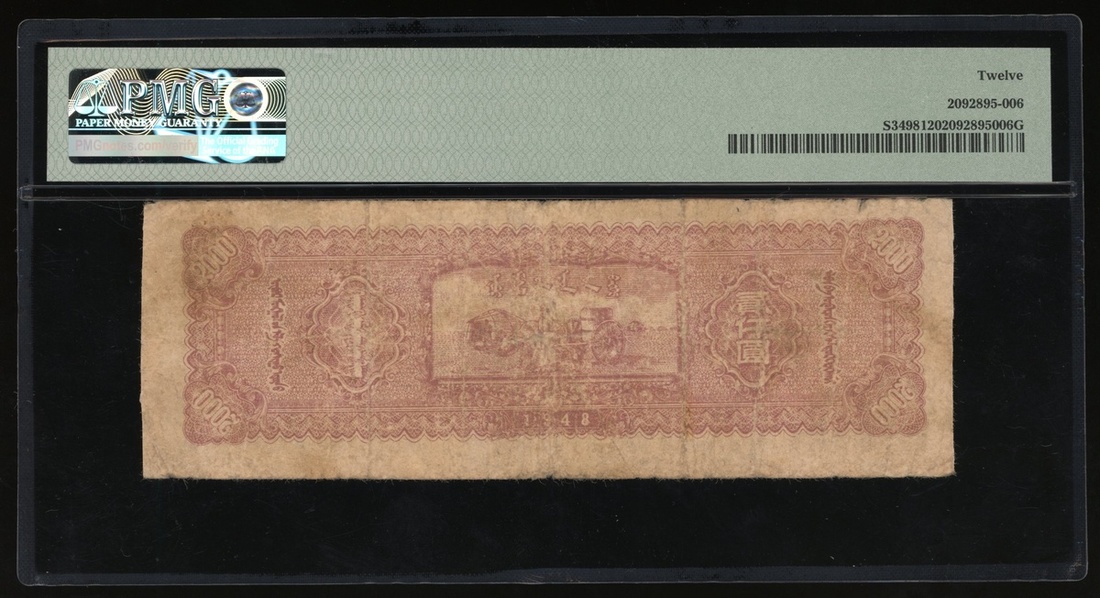 民國三十七年內蒙古人民銀行貳仟圓,編號XE 036595,PMG 12,所有蒙古紙鈔皆市場罕見