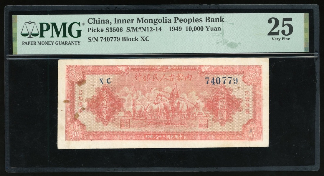 Inner Mongolia Peoples Bank, China, 10,000 yuan, 1949, serial number 740770, block XC, (Pick S3506), PMG 25 Very Fine (rust). One of four examples graded by PMG Census. The second highest denomination of the series and the last series of the Mongolia communist banks. Very rare