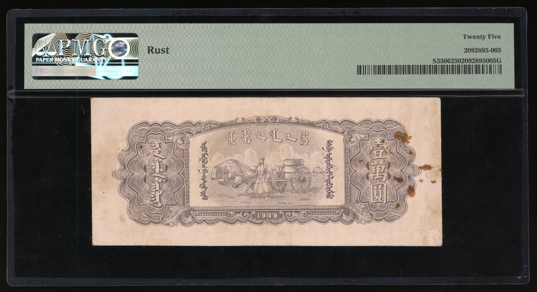 民國三十七年內蒙古人民銀行壹萬圓,編號XC 740770,PMG 25,有漬,PMG僅得4枚記錄,本系列之第二高面值,同時為內蒙古最後發行之共產版別,極罕