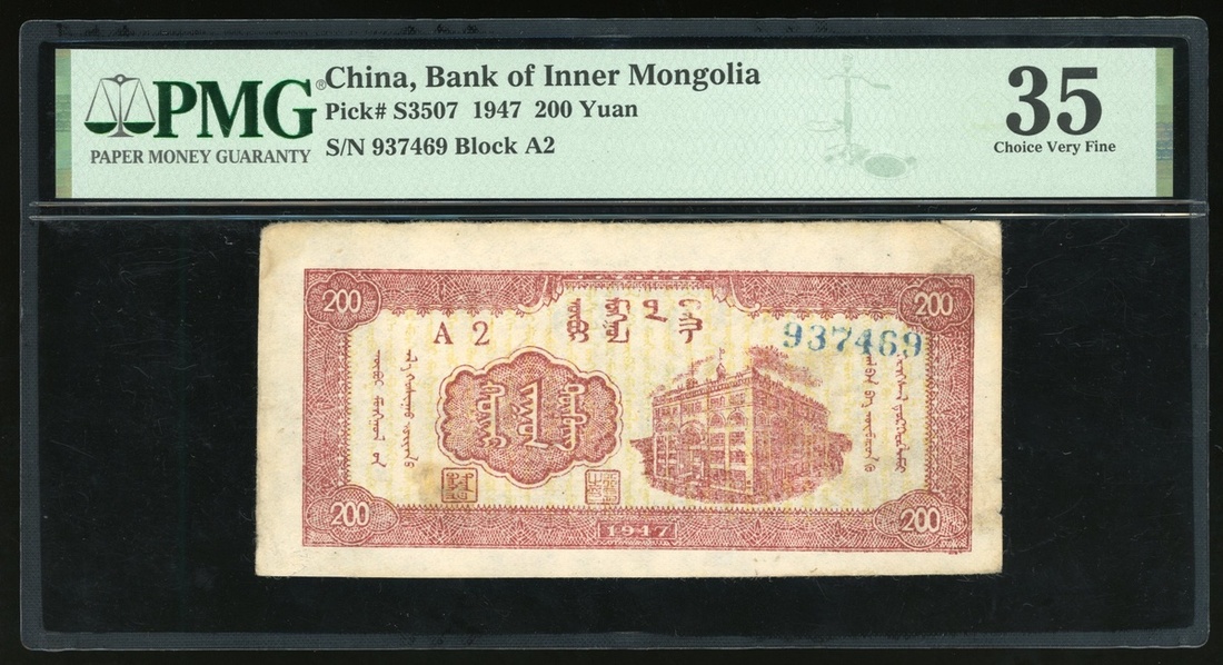 Bank of Inner Mongolia, China, 200 yuan, 1947, serial number 937469, block A2, (Pick S3507), PMG 35 Choice Very Fine (foreign substance, small tear). PMG Census Top Pop! One of two. Any Mongolia note rare
