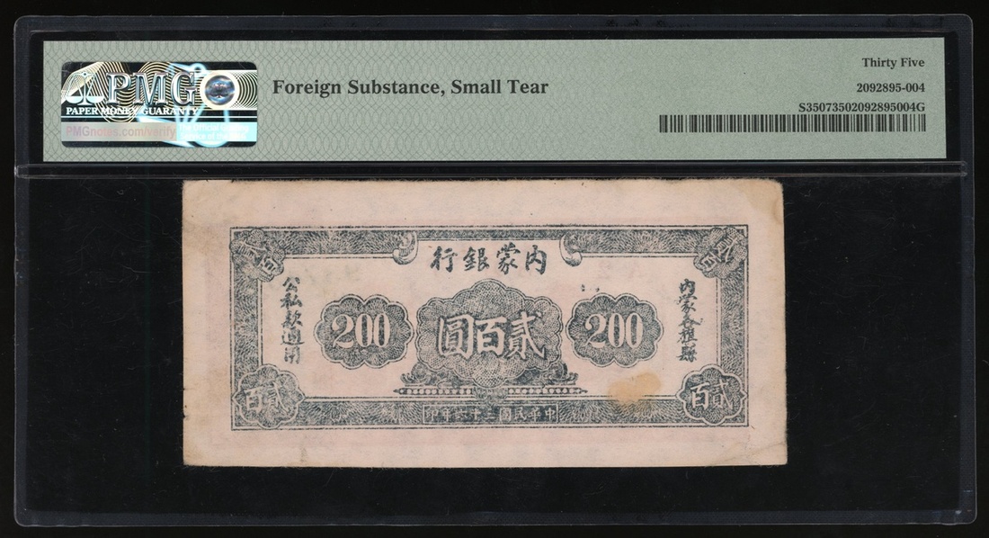 民國三十七年內蒙古人民銀行貳百圓,編號A2 937469,PMG 35,有外附物及微裂,PMG僅得2枚記錄,本品為最高分,所有蒙古紙鈔皆市場罕見