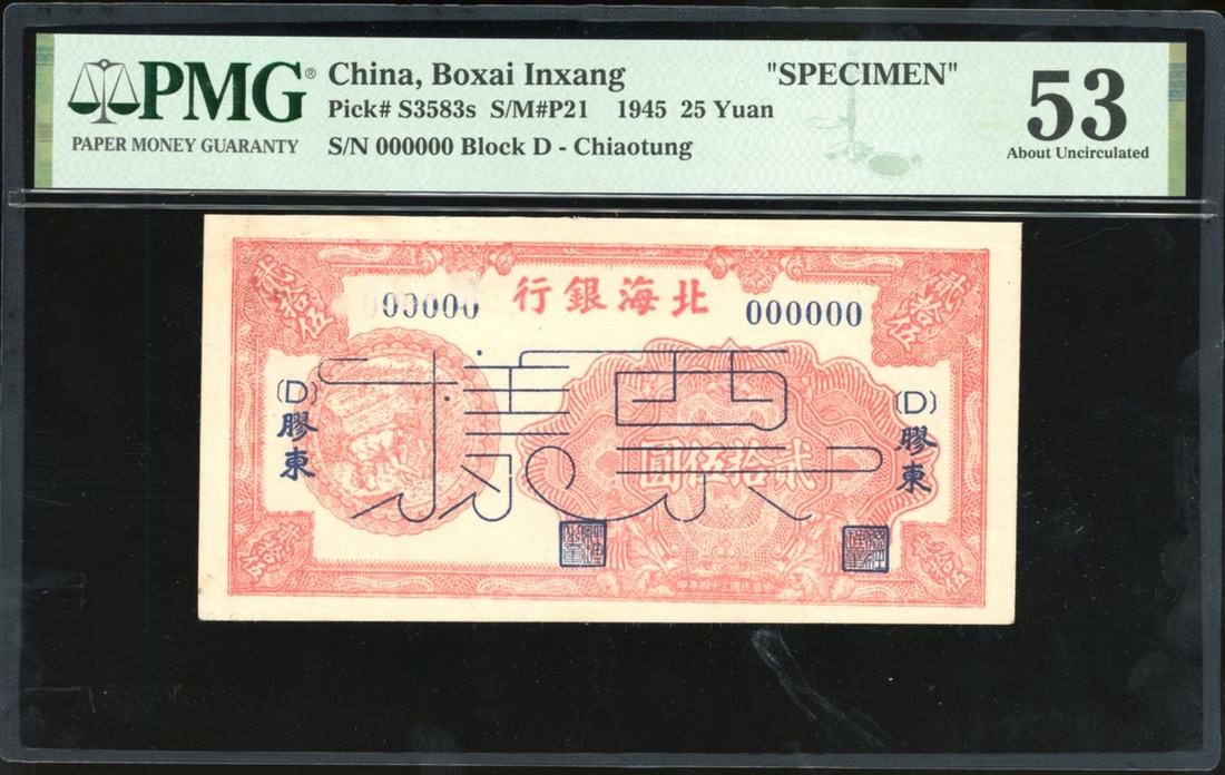 民國三十四年北海銀行貳拾伍圓樣鈔,膠東地名,編號(D)000000,PMG 53,有黏貼痕跡,PMG唯一之記錄