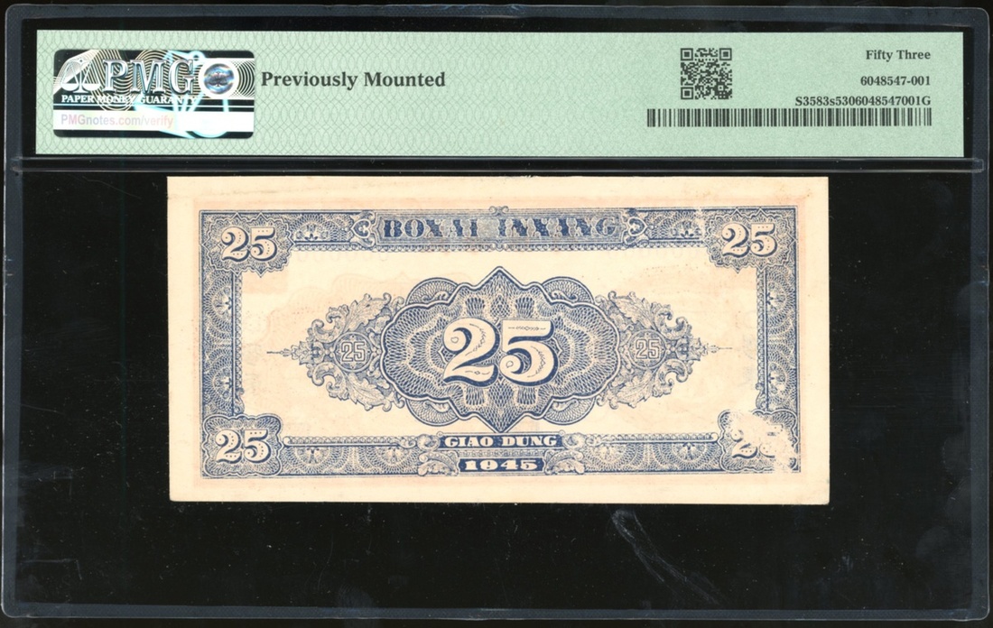 Boxai Inxang, China, 25 yuan, 1945, Giao Dung, specimen, serial number 000000, block D, (Pick S3583s), PMG 53 About Uncirculated (Previously Mounted). The ONLY note in the PMG population report!