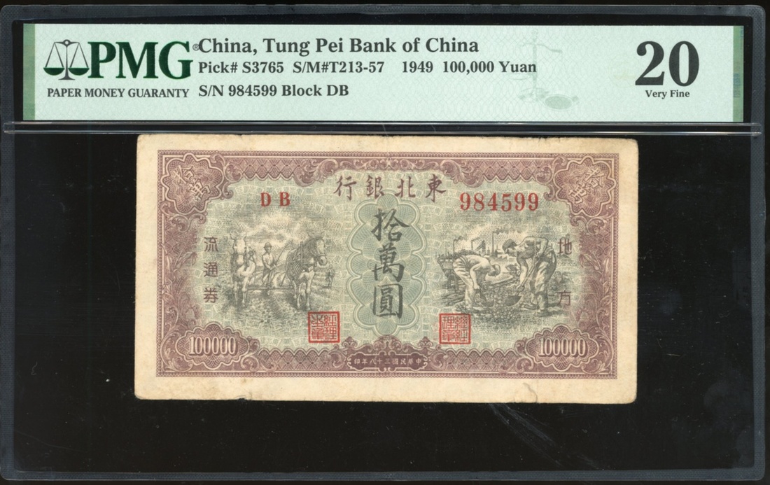 Tung Pei Bank of China, 100,000 yuan, 1949, serial number DB 984599, (Pick S3765), PMG 20 Very Fine