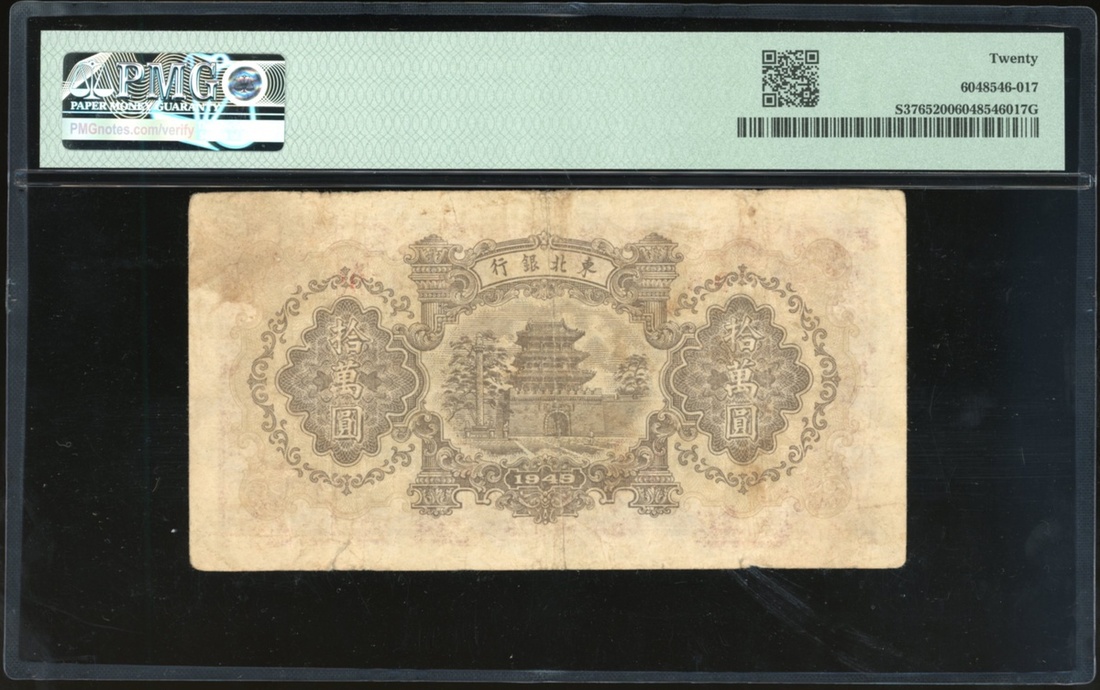 民國三十八年東北銀行拾萬圓,編號DB 984599,PMG 20