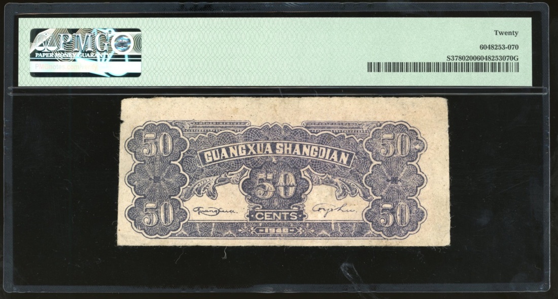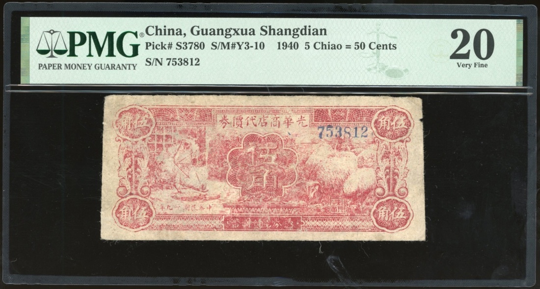 Guangxua Shangdian, China, 50 cents, 1940, serial number 753812, (Pick S3780), PMG 20 Very Fine and rare, only 15 of such notes in the PMG population report, with only 3 graded higher