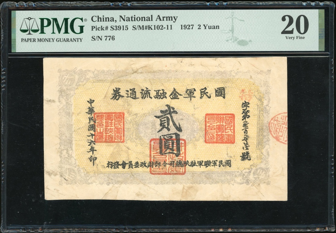 China, National Army, 2 yuan, 1927, serial number 776, (Pick S3915), PMG 20 very fine, rare.