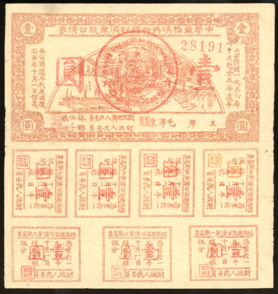 Chinese Soviet Republic, Economic and Construction Government Bond, 1 yuan bond, 1936, serial number 28191, with coupons, with seal of Mao Zedong,
