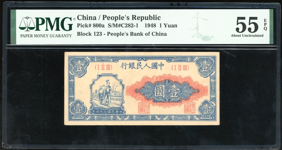 People's Bank of China, 1 yuan, '1st series renminbi', 1948, block I II III, 'Farmer and Factory Worker' (Pick 800a), PMG 55EPQ About Uncirculated.