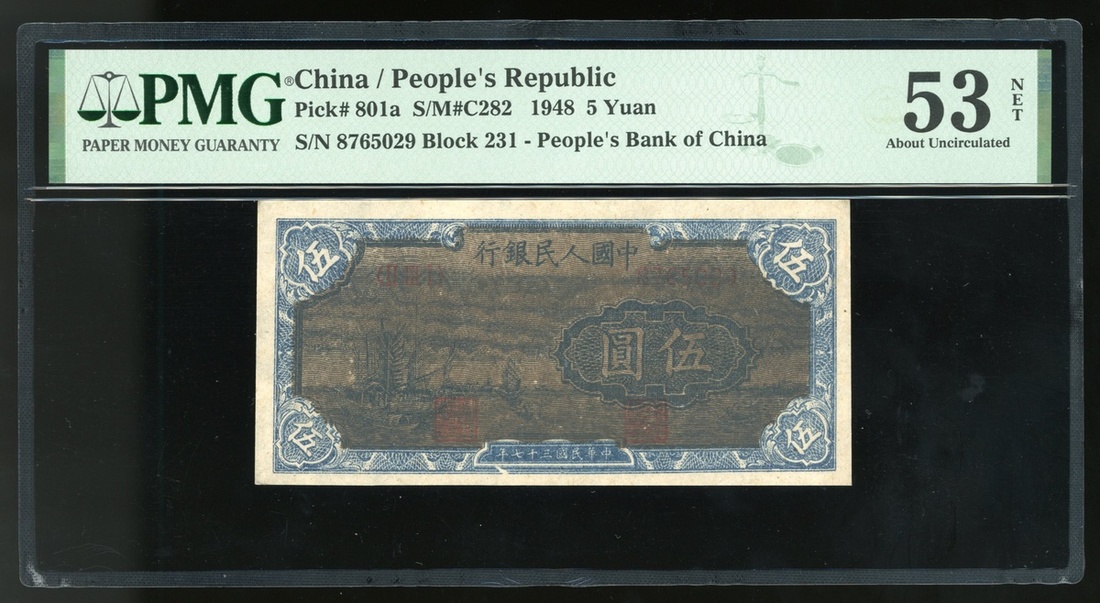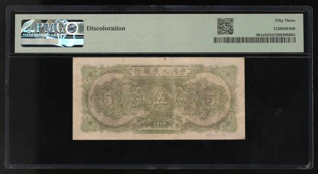 1948年中國人民銀行第一版人民幣伍圓「小帆船」,編號II III I 8765029,PMG 53NET,有褪色