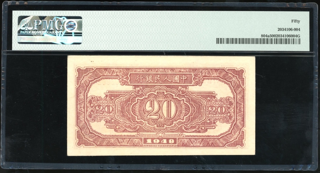 1948年中國人民銀行第一版人民幣貳拾圓「驢子與火車」,編號I II III 00285882,PMG 50