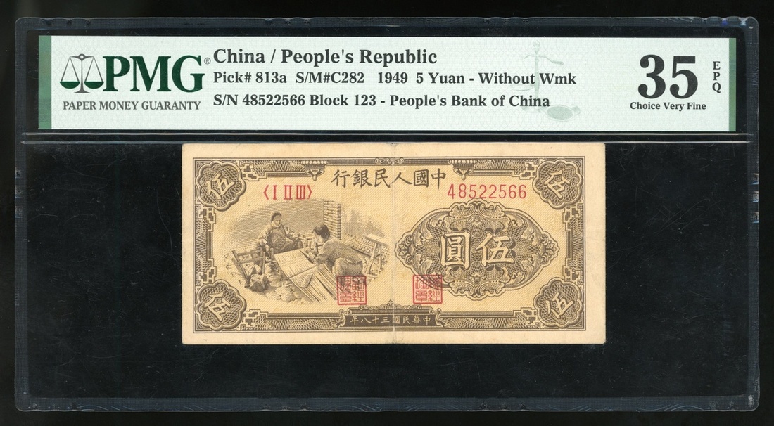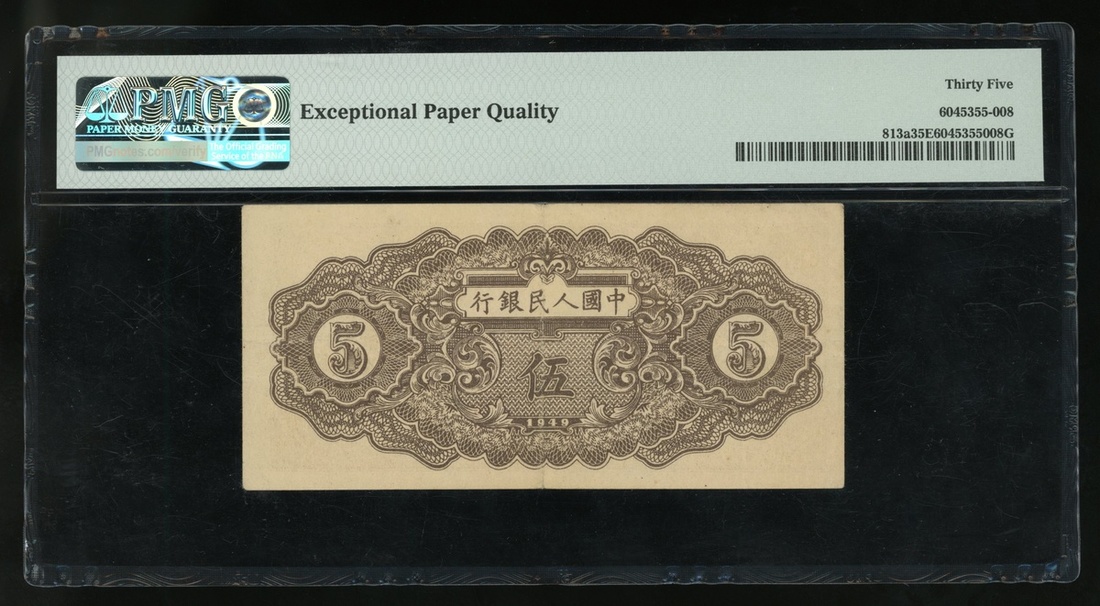 1949年中國人民銀行第一版人民幣伍圓「紡織」,編號I II III 48522566,PMG 35EPQ