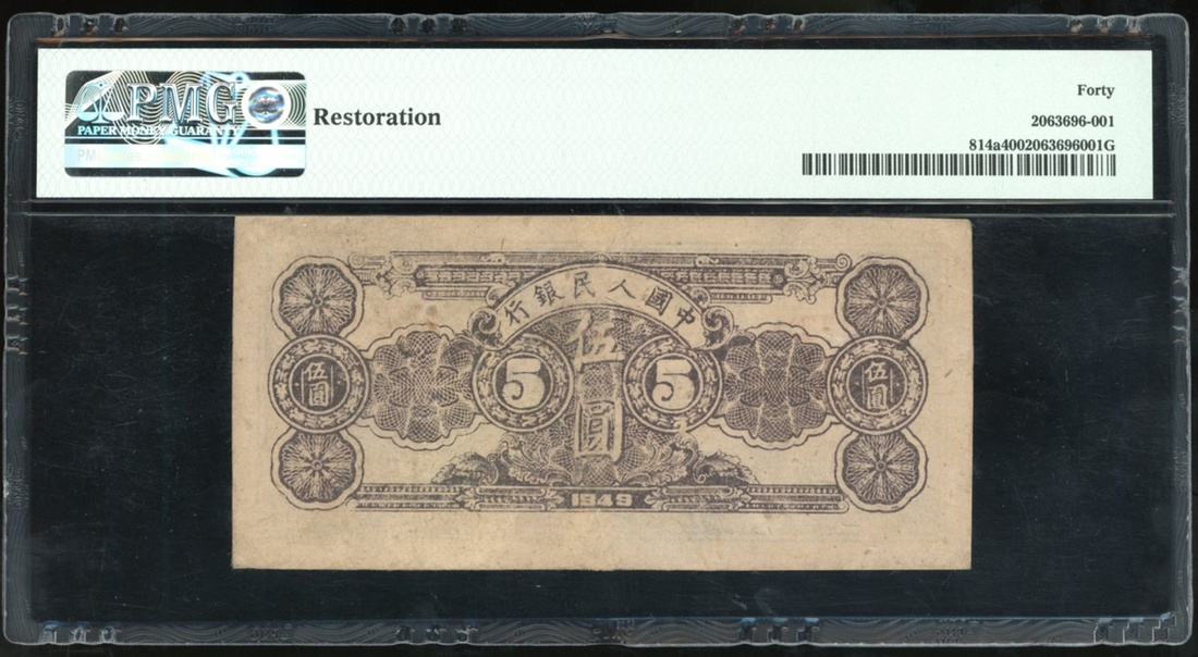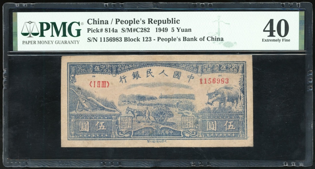 1949年中國人民銀行第一版人民幣伍圓「水牛」,編號I II III 1156983,PMG 40,有修補