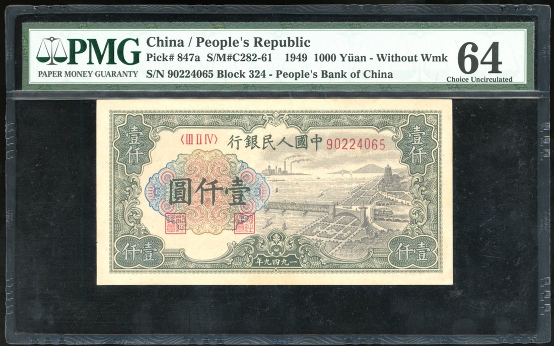 People's Bank of China, 1000 yuan, '1st series renminbi', 1949, serial number III II IV 90224065, 'Qiantang Bridge', (Pick 847a), PMG 64 Choice Uncirculated.