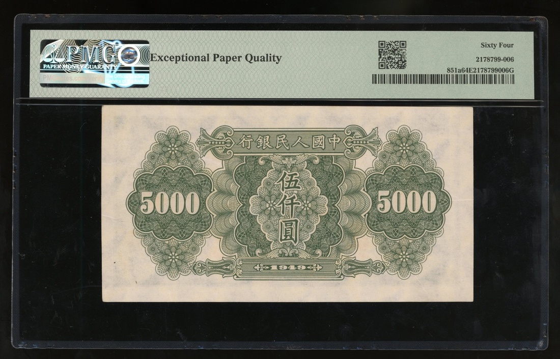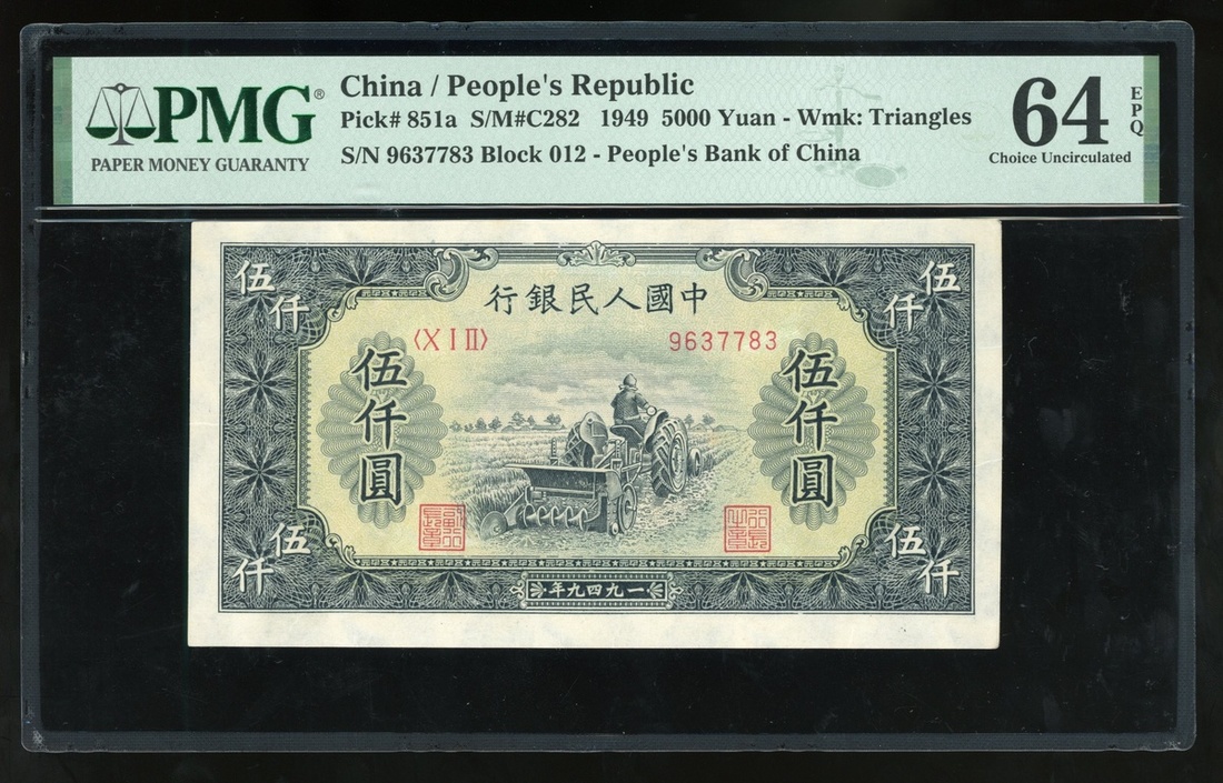 1949年中國人民銀行第一版人民幣5000元「拖拉機」,編號X I II 9637783,PMG 64EPQ,罕見高分,深受市場歡迎的原裝品相