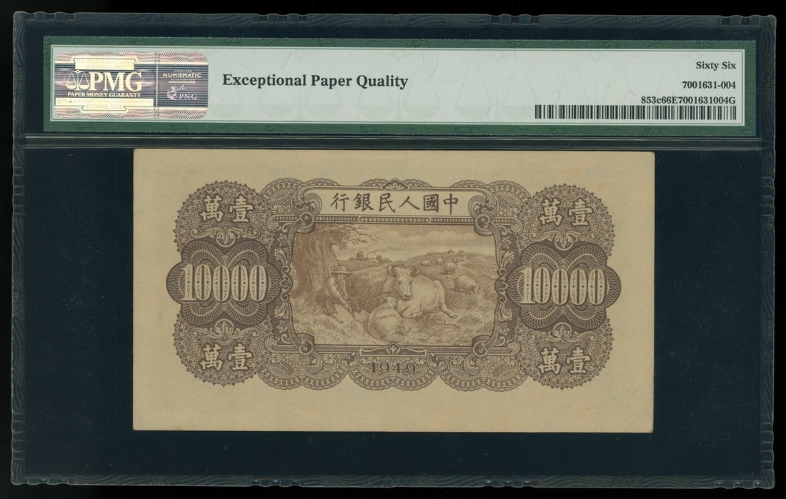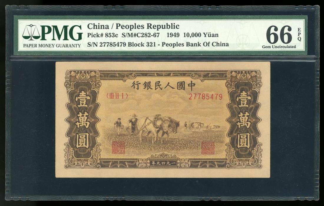 1949年中國人民銀行第一版人民幣10,000元「雙馬耕地」,編號III II I 27785479,PMG 66EPQ,不可多得之高分美品