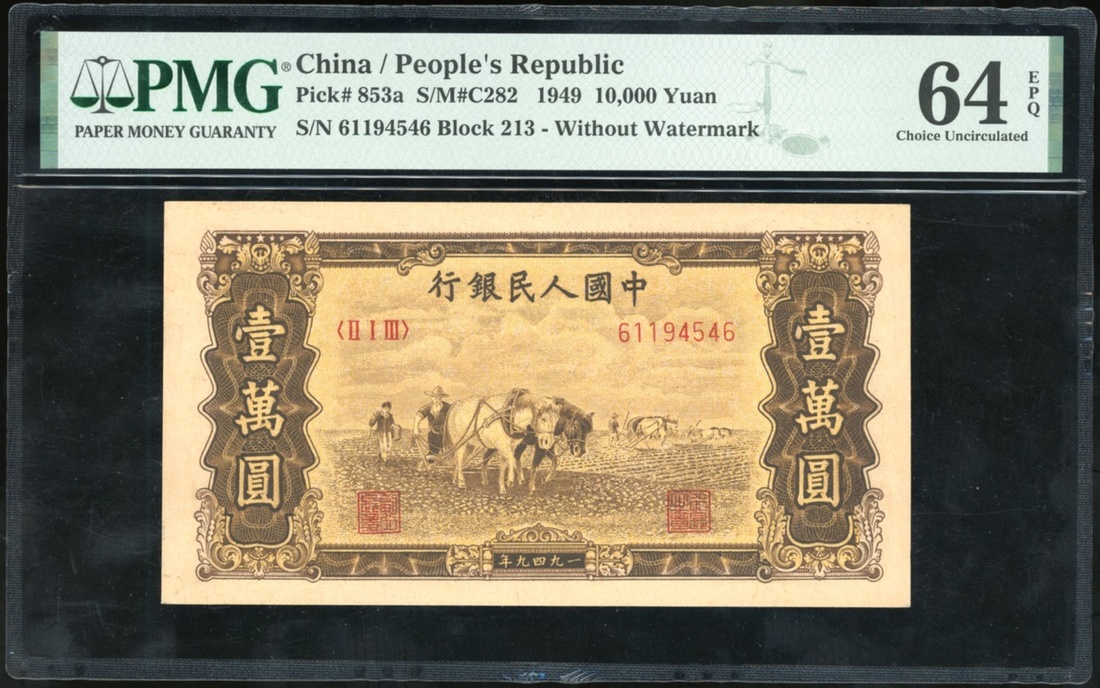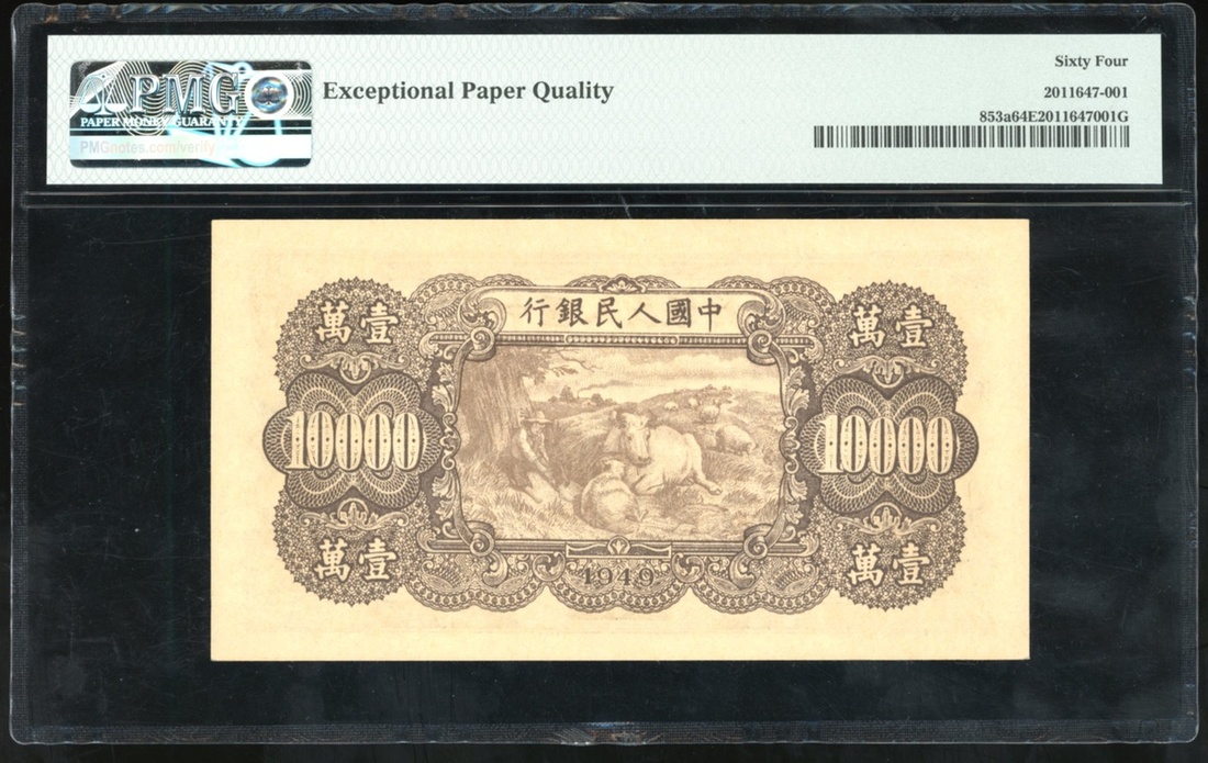 1949年中國人民銀行第一版人民幣10,000元「雙馬耕地」,無水印,編號 II I III 61194546,PMG 64EPQ,少見台灣印刷版