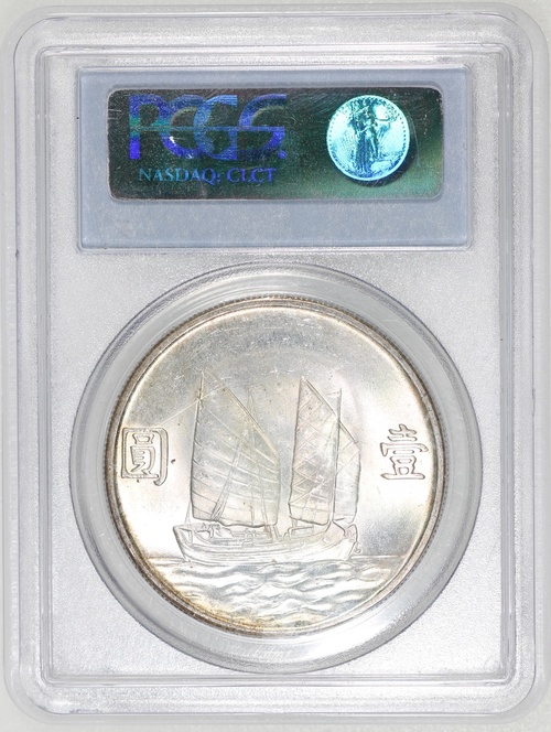 民國二十三年孫中山像帆船壹圓銀幣,正面及幣邊有輕微包漿,PCGS MS65,#16105639