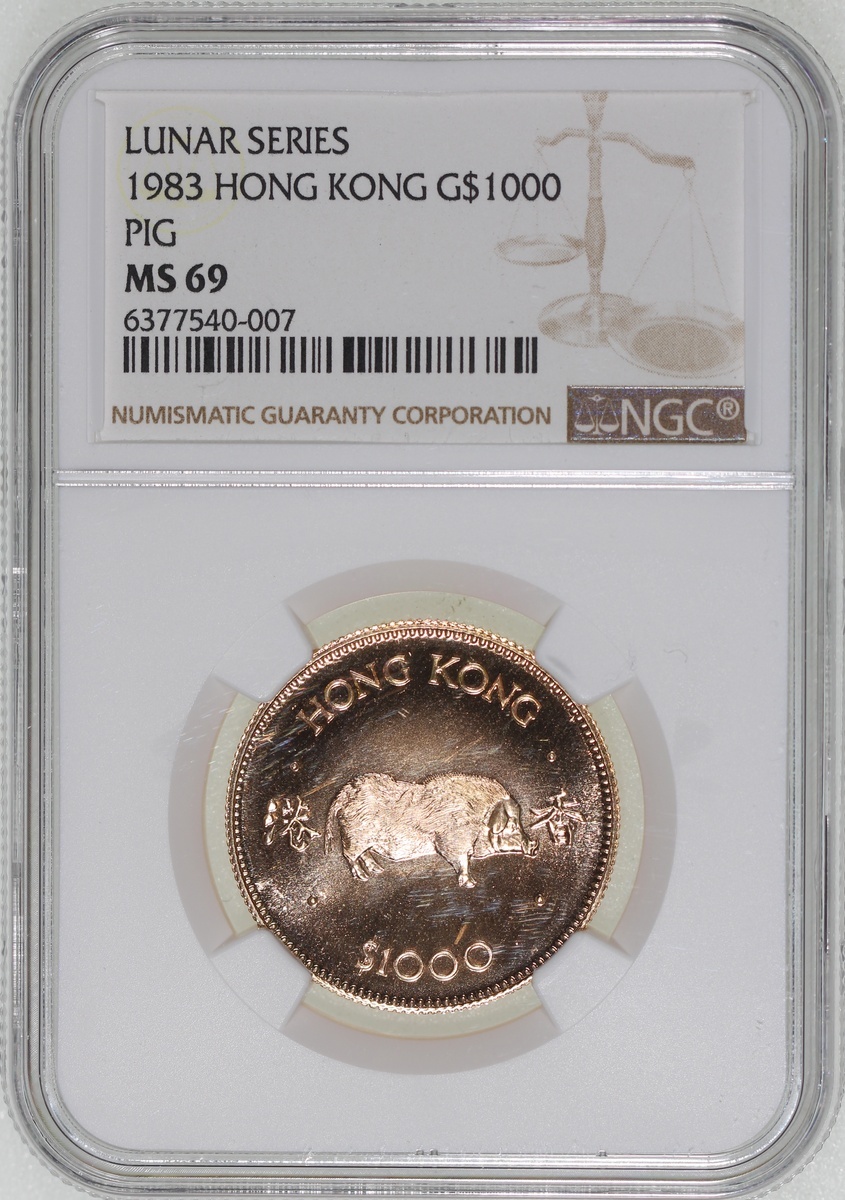 1983年香港十二生肖豬年$1000紀念金幣,NGC MS69,#6377540-007,連小冊子