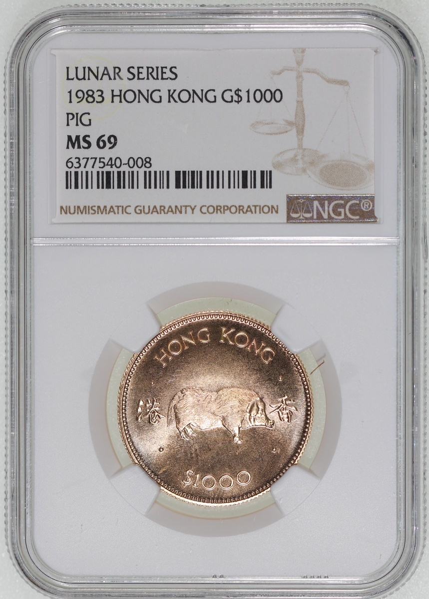 1983年香港十二生肖豬年$1000紀念金幣,NGC MS69,#6377540-008,連小冊子