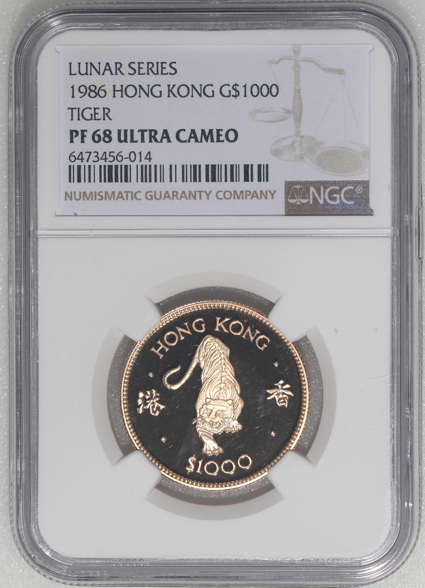 1986年香港十二生肖虎年$1000紀念精鑄金幣,NGC PF68 Ultra Cameo,#6473456-014,連盒及小冊子