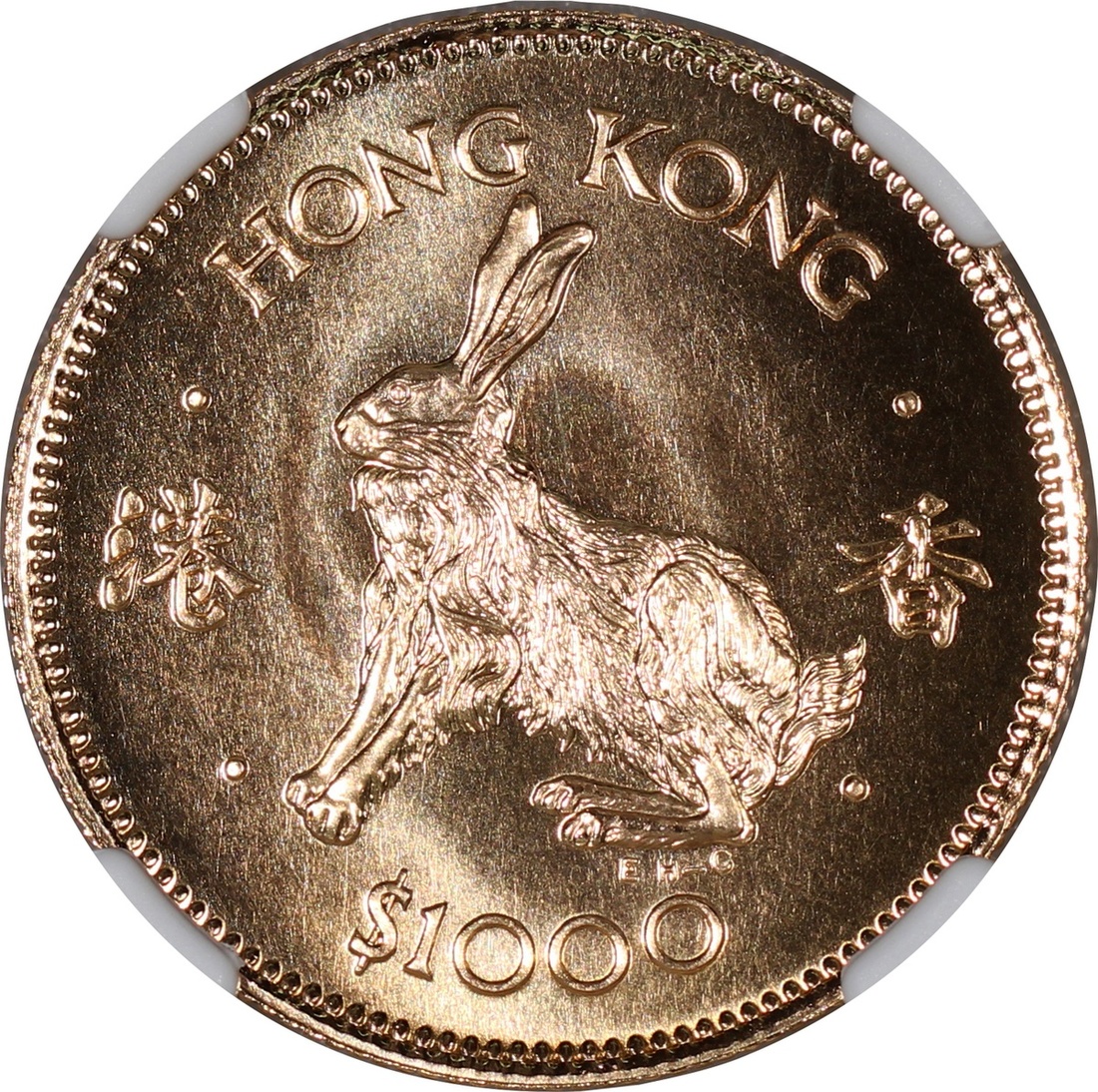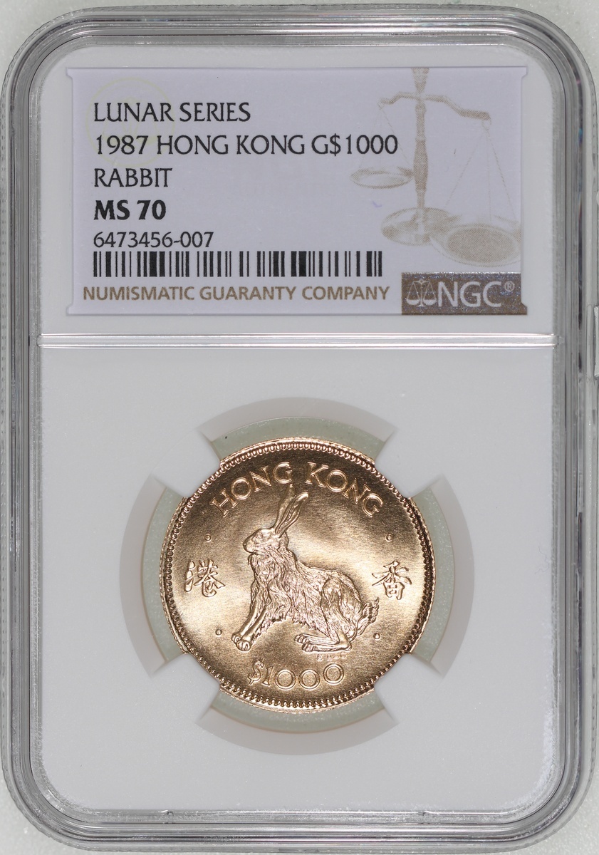 Hong Kong, gold $1000, 1987, Year of the Rabbit, NGC MS70, cert. #6473456-007