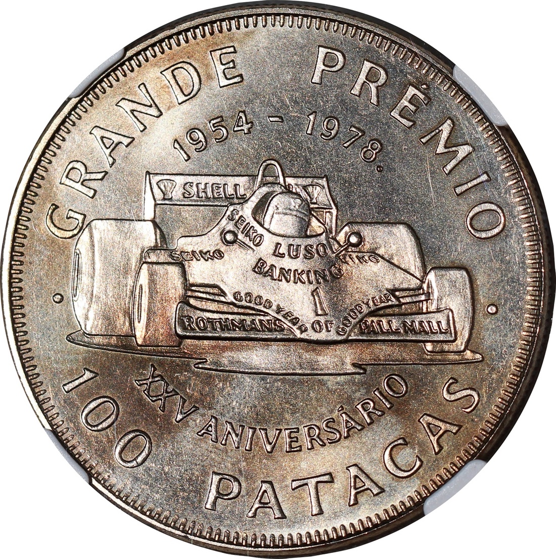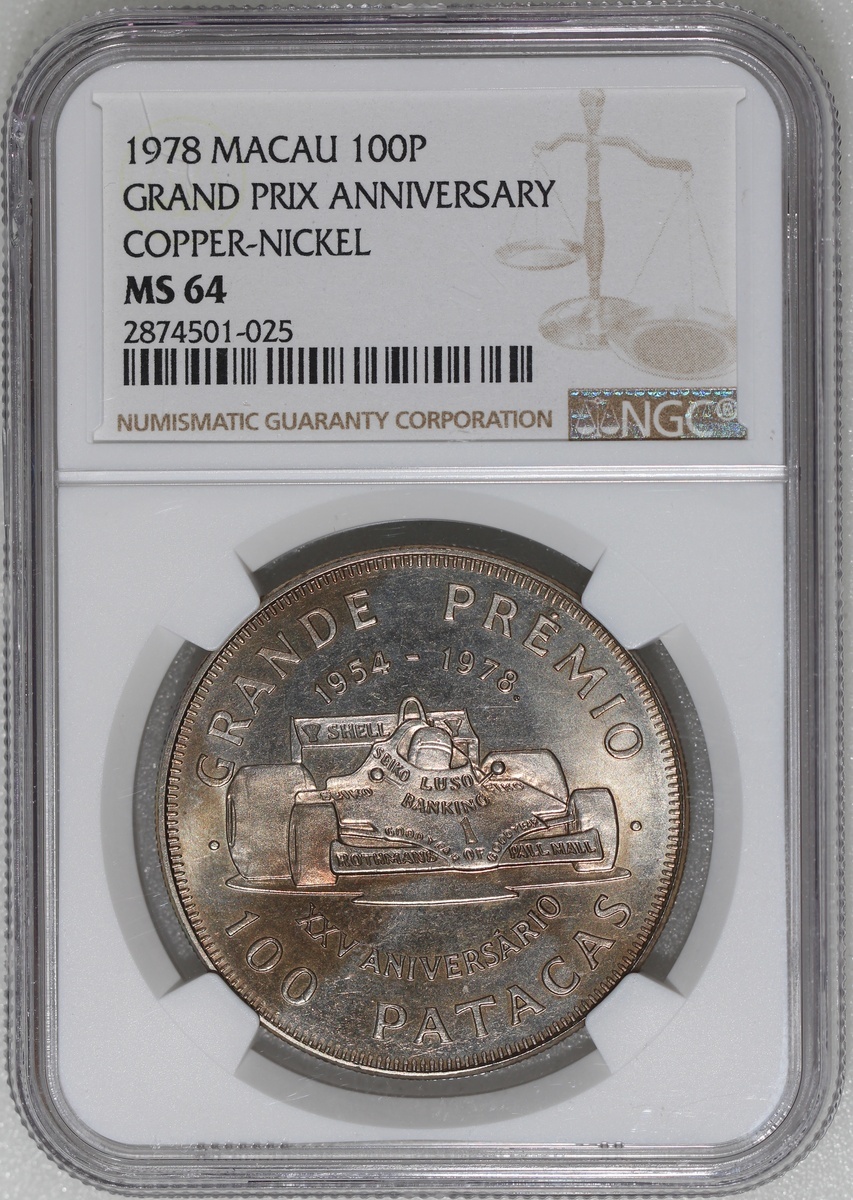 Macau, copper nickel 100 patacas, 1978, commemorative issue of the 25th Grand Prix Anniversary, with advertising logo, NGC MS64, rare issue. Cert.#2874501-025