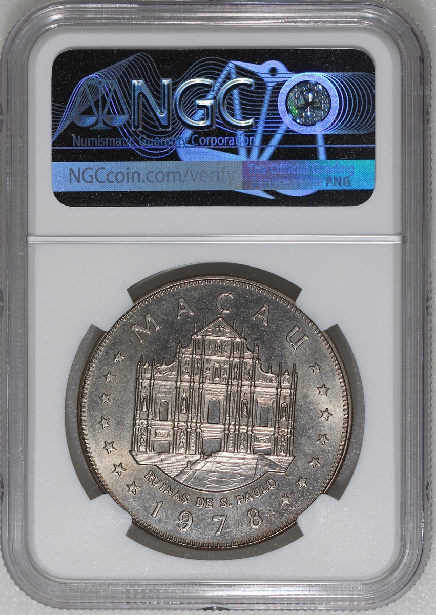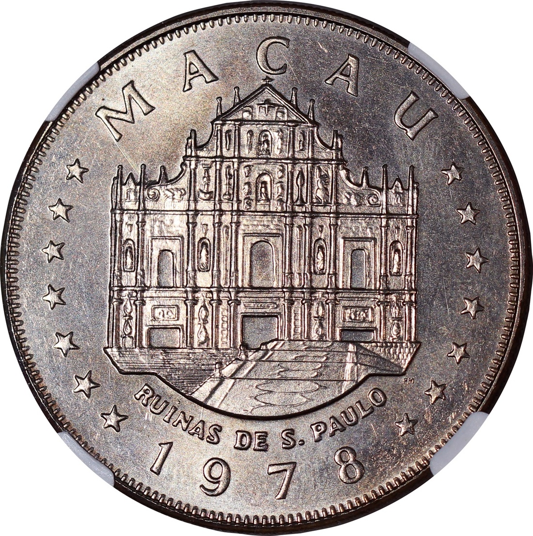 1978年澳門鎳銅幣100元,格蘭披治大賽車25周年紀念,帶廣告版,NGC MS 64,#2874501-025,罕見版別