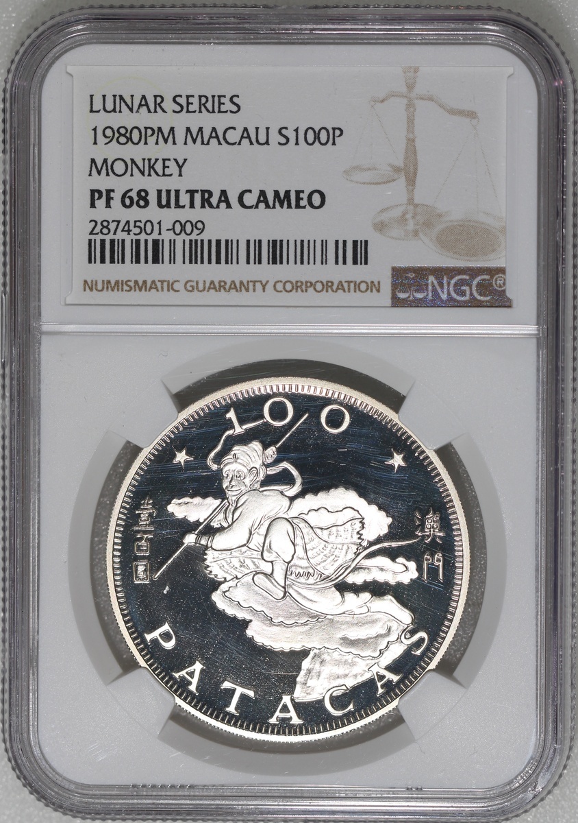 1980年澳門十二生肖猴年$100紀念精鑄銀幣,NGC PF68 Ultra Cameo,#2874501-009,罕見