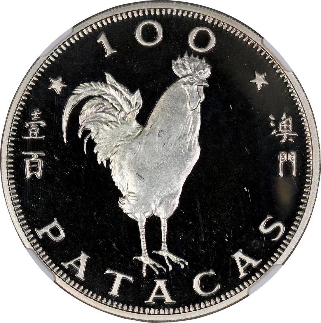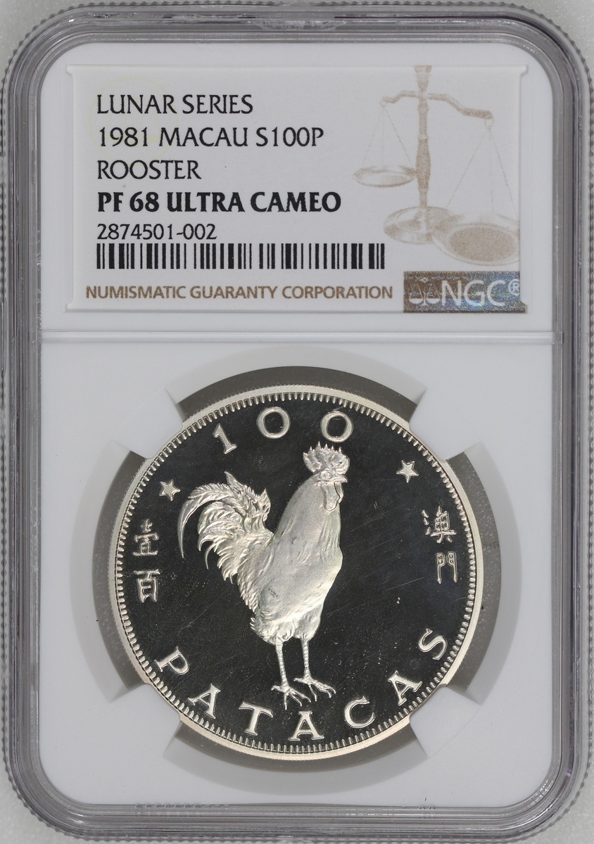 1981年澳門十二生肖雞年$100紀念精鑄銀幣,NGC PF68 Ultra Cameo,#2874501-002