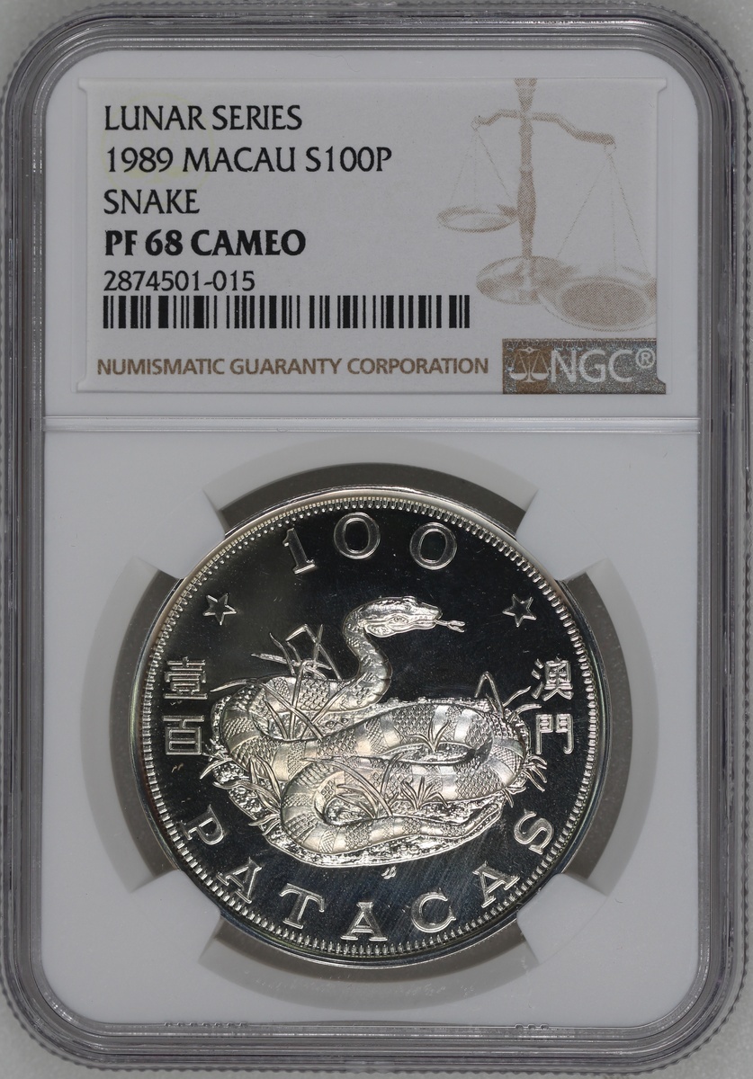 1989年澳門十二生肖蛇年$100紀念精鑄銀幣,NGC PF68 Ultra Cameo,#2874501-015