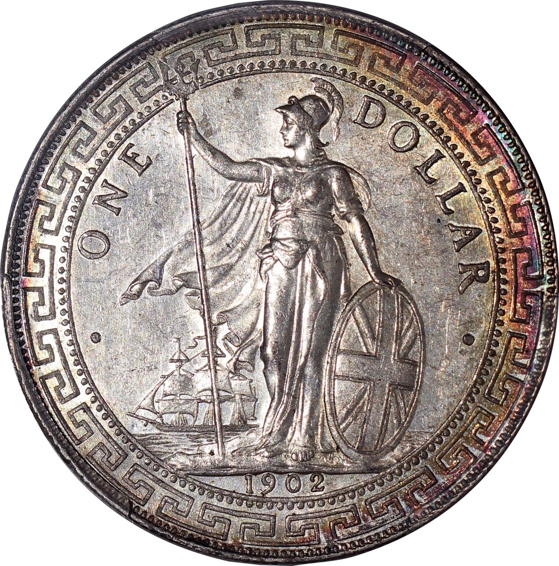 Great Britain, Trade Dollar, silver $1, 1902-B, good toning at the rim at obverse and reverse, PCGS MS63. Cert.# 43811283