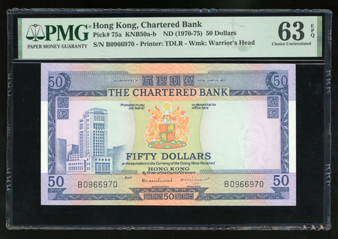 The Chartered Bank, Hong Kong, $50, ND(1970-75), serial number B0966970, (Pick 75a), PMG 63EPQ.