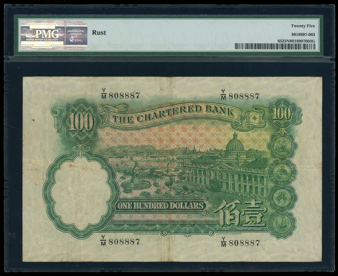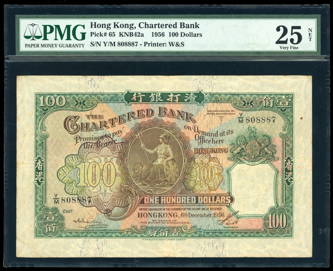 Chartered Bank, Hong Kong, $100, 6 December 1956, serial number Y/M 808887, (Pick 65), PMG 25 NET Very Fine (rust). A presentable example for type