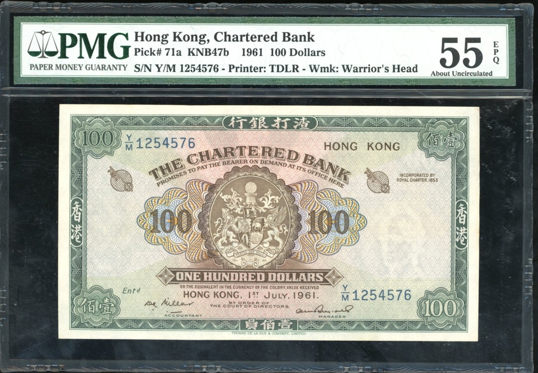 1961年渣打銀行100元,編號Y/M 1254576,PMG 55EPQ,評級報告當中最高分是58分,但沒有像此品獲評EPQ級,非常罕見