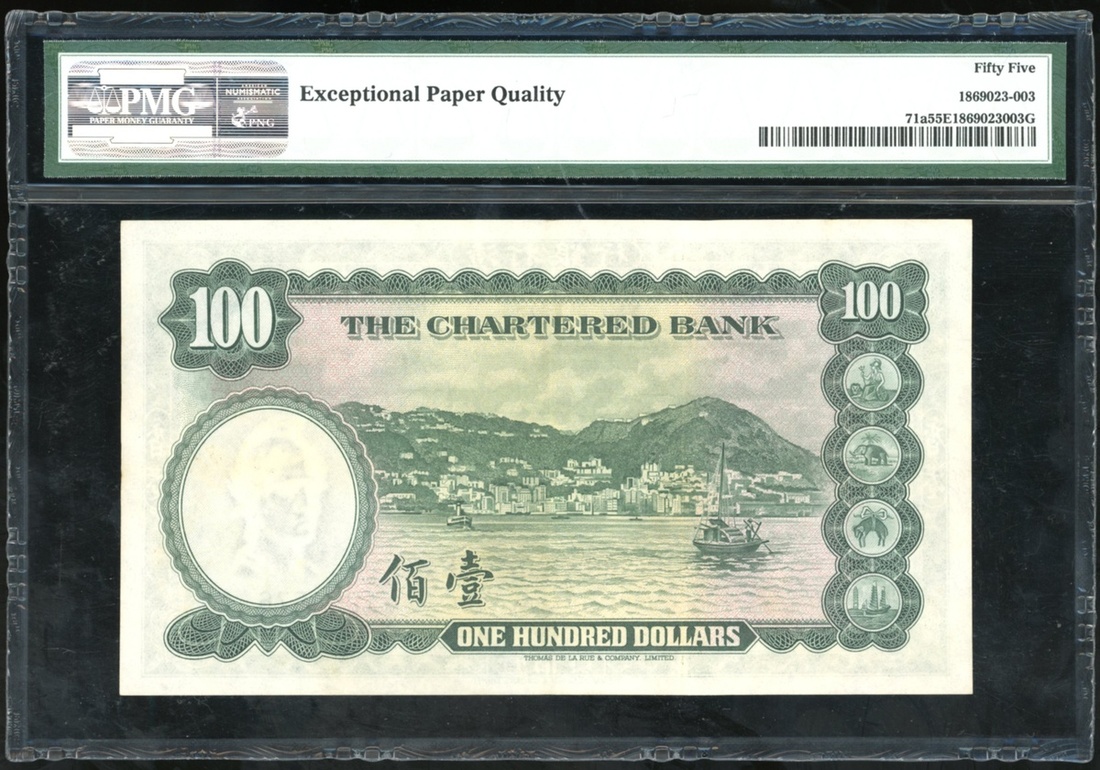 The Chartered Bank, $100, 1.7.1961, serial number Y/M 1254576, (Pick 71a), PMG 55 EPQ, the highest grade in PMG population is 58 only and without EPQ, thus scarce.