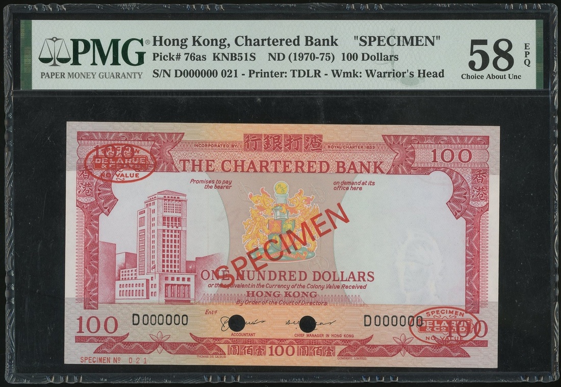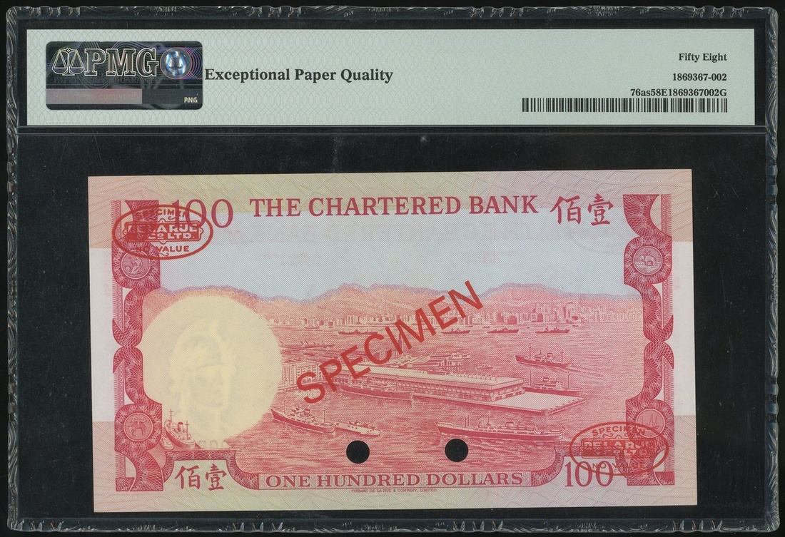 1970-1975年渣打銀行100元樣票,編號D000000,PMG 58EPQ,德納羅印刷公司的樣票當中鮮有沒有黏貼痕跡,珍罕