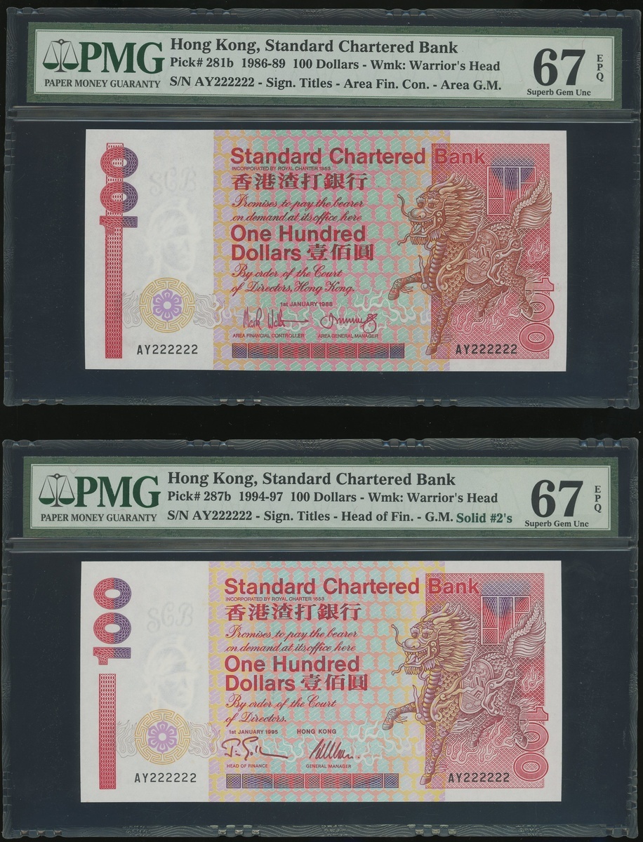 Standard Chartered Bank, Hong Kong, a pair of $100, 1988 and 1995, matching solid serial number AY222222, (Pick 281b, 287b), both graded PMG 67EPQ.(2)