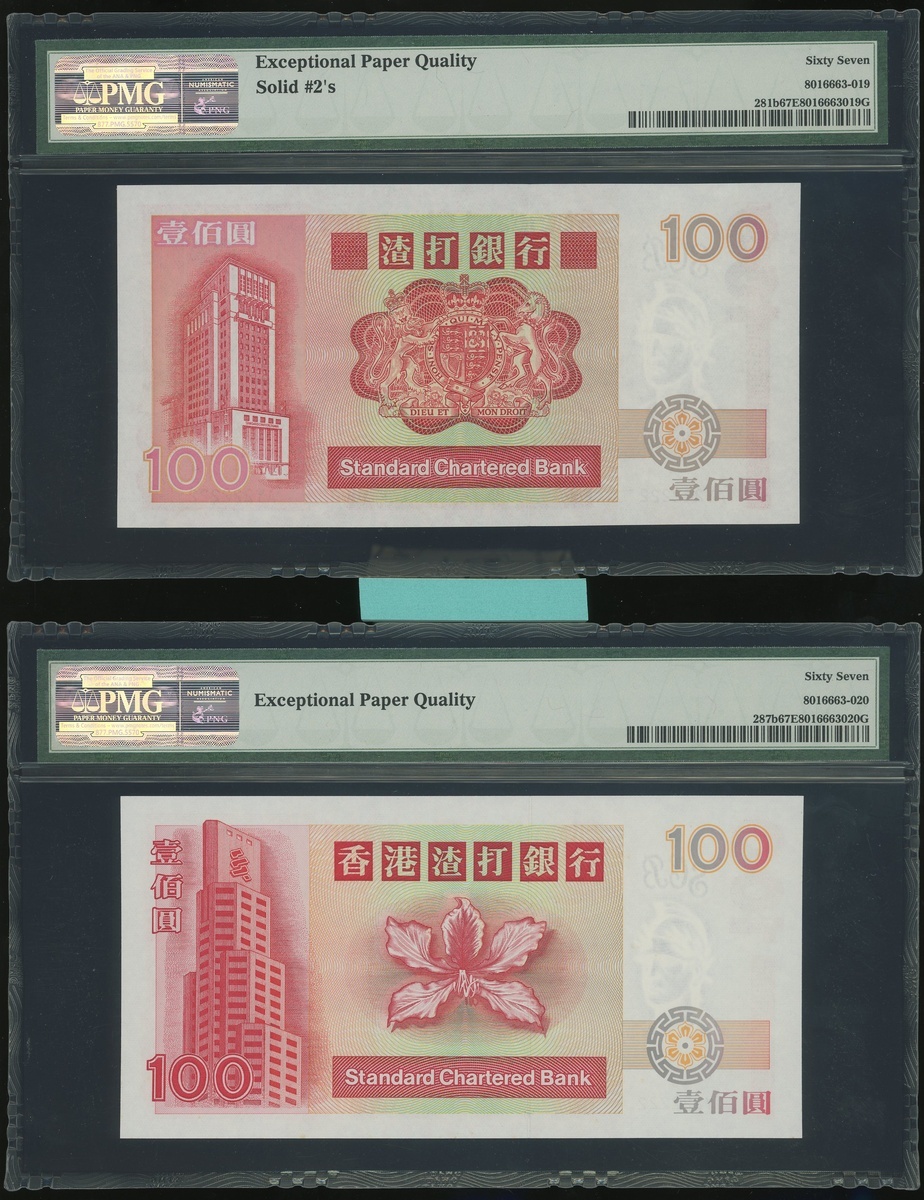 1988和1995年渣打銀行100元一對,相同幸運號AY222222,PMG均評67EPQ