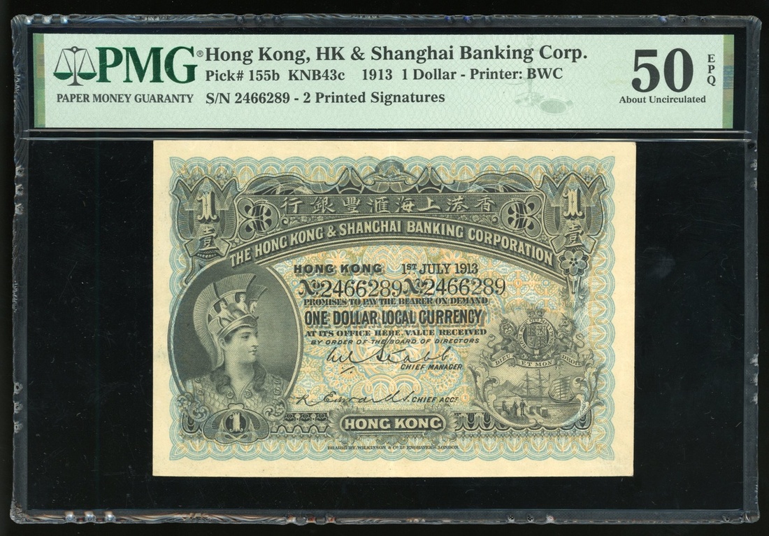 1913年香港上海匯豐銀行1元,編號2466289,PMG 50EPQ,此版別鮮見獲評EPQ