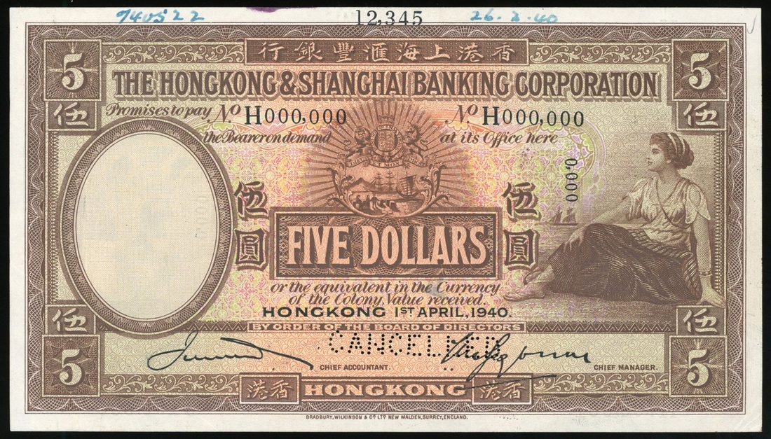 HongKong and Shanghai Banking Corporation, specimen $5, 1 April 1940, serial number range H700,001 - J100,000, (Pick 173cs), printers annotation at top margin, CANCELLED perforated. Ink at top margin. Minor mounting traces at reverse left margin, with some heavier handling, about uncirculated. Note this is the scarcer type with extra 4 digit serial number printed vertically. Very scarce
