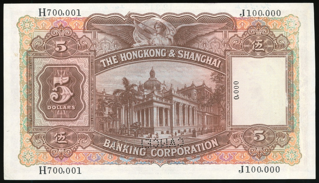 1940年香港上海匯豐銀行5元樣票,編號H700,001至J100,000,打孔注銷,有印刷商筆註,背面左邊有少量黏貼痕跡,約UNC品相,還有較少見的豎行編碼,稀品