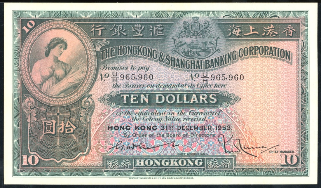 The Hongkong and Shanghai Banking Corporation, $10, 31.12.1953, serial number U/H 965960, with embossing visible, (Pic 179Aa), Uncirculated
