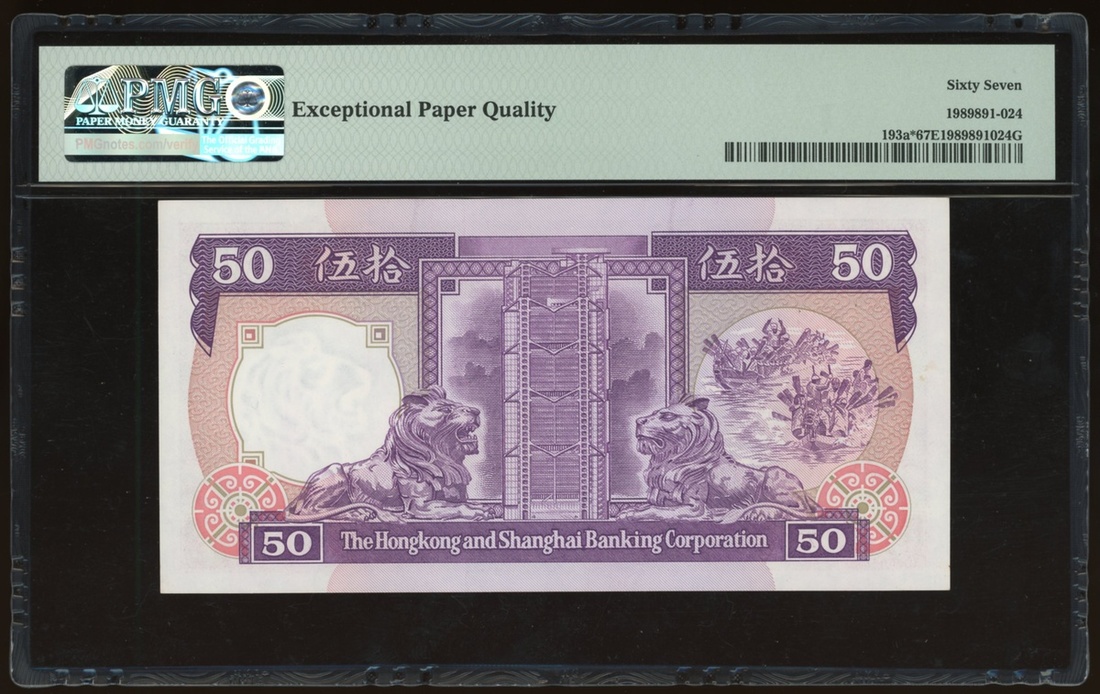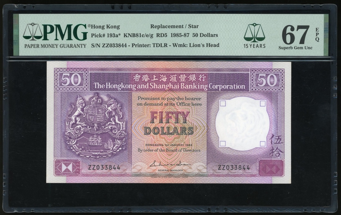 The Hongkong and Shanghai Banking Corporation, $50, replacement, 1.1.1986, serial number ZZ033844, (Pick 193a*), PMG 67EPQ Superb Gem Uncirculated.