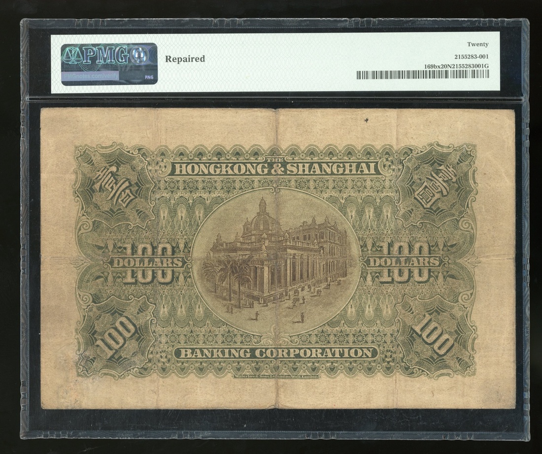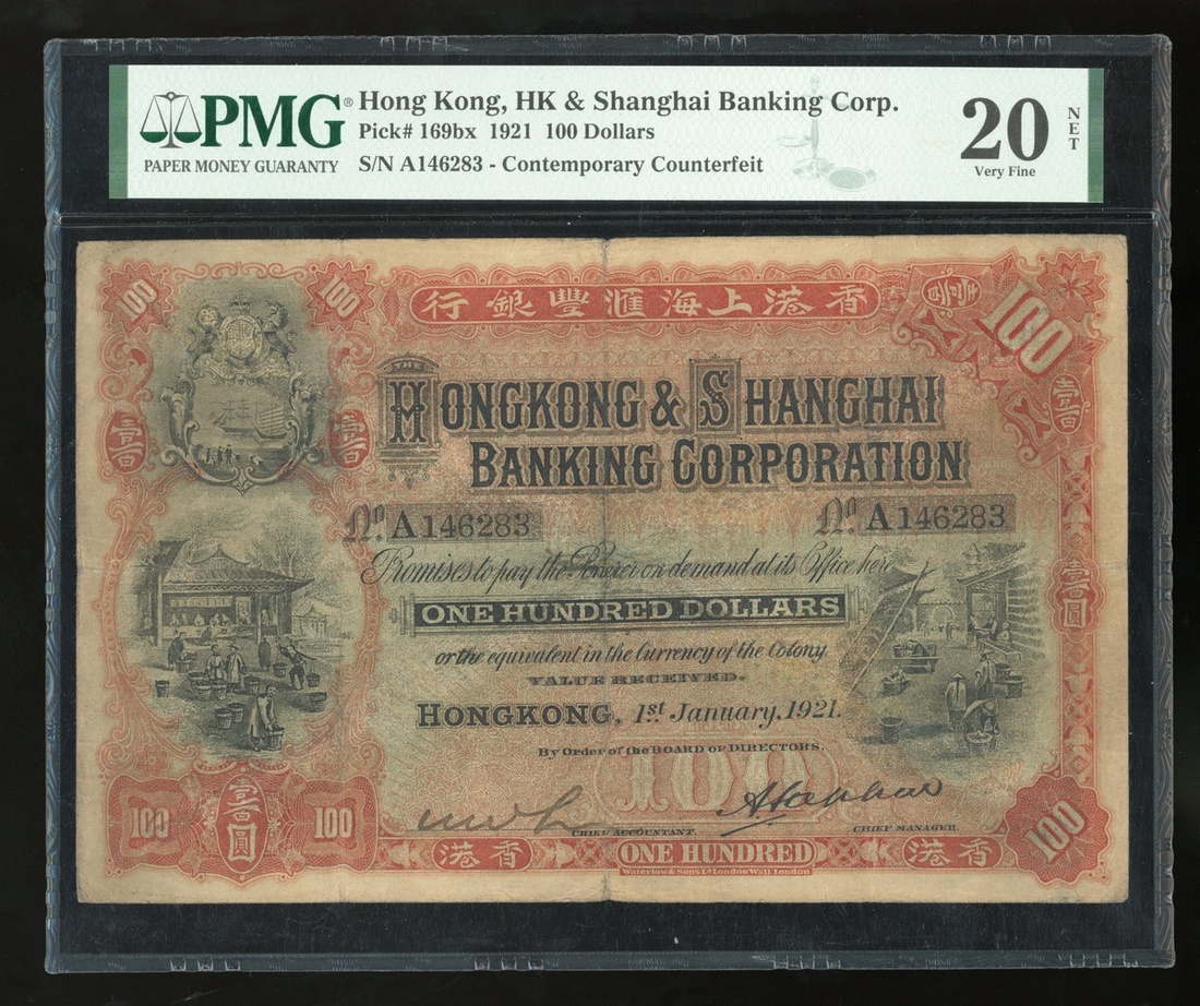 Hong Kong & Shanghai Banking Corporation, CONTEMPORARY COUNTERFIET $100, 1 January 1921, serial number A146283, (Pick 169bx), PMG 20 NET, repaired.