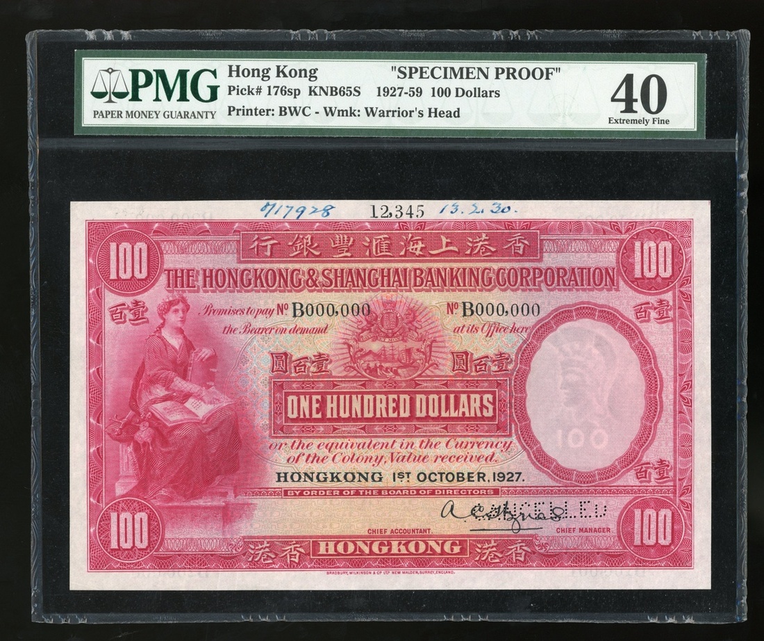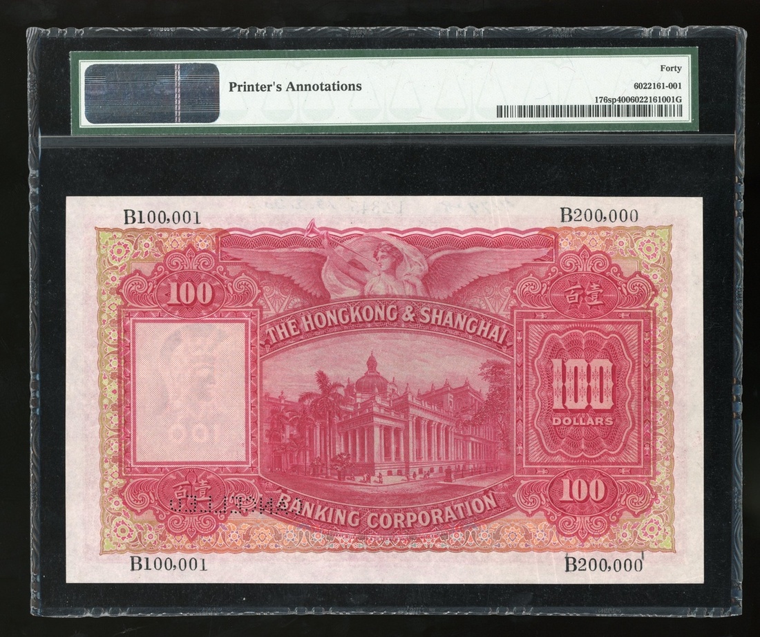 1927年香港上海匯豐銀行100元樣票,編號B100,001至200,000,PMG 40,有印刷商註解,編號是白普理印刷廠獨有,格外珍貴