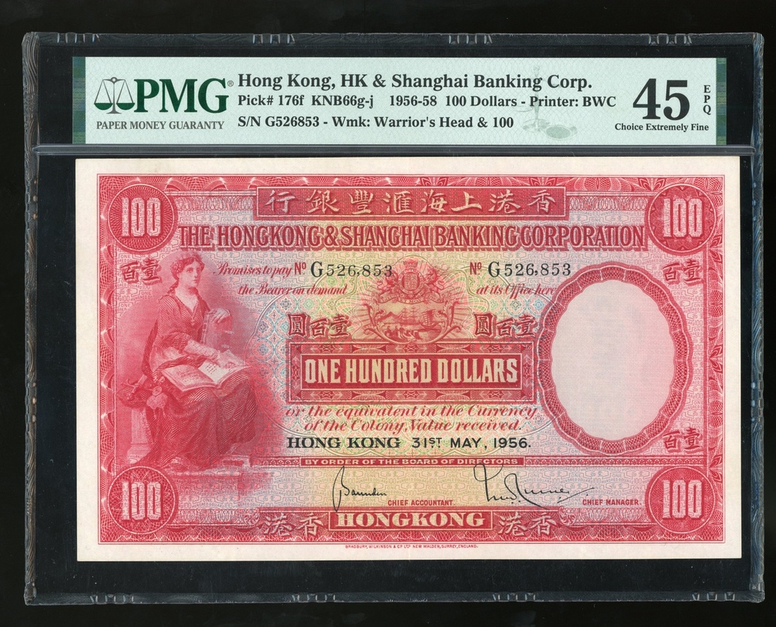 The Hongkong and Shanghai Banking Corporation, $100, 31.5.1956, serial number G526853, (Pick 176f), PMG 45EPQ Choice Extremely Fine, scarce original example with EPQ designation