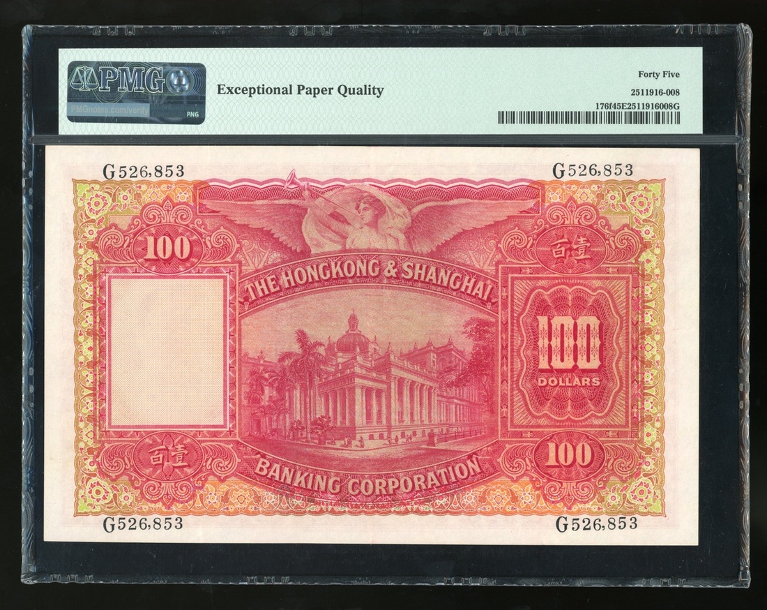 1956年香港上海匯豐銀行100元,編號G526853,PMG 45EPQ,稀有原裝品相並獲評EPQ